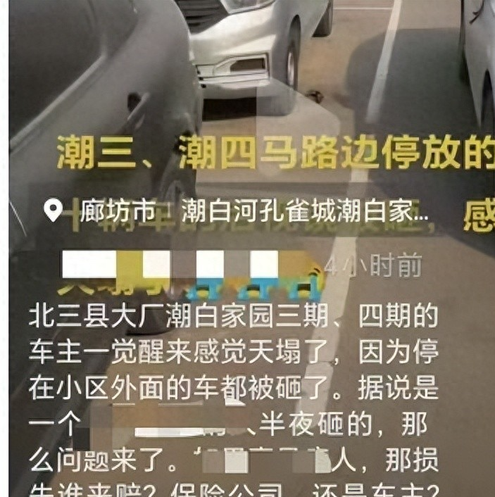 哎,你说这大半夜的,谁这么缺德?廊坊大厂孔雀城附近,一夜之间,将近一百辆车遭了殃,反光镜、后尾灯,哎,简直是惨不忍睹!这到底是怎么一回事?咱先来看看这热闹吧。