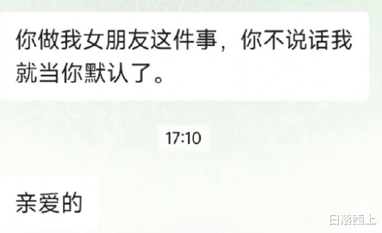 即使女孩不回复,相亲对象也不“退缩”,直说:“你做我女朋友这件事,你不说话我就当你默认了。亲爱的。”