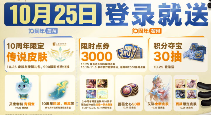 说到王者荣耀的十周年庆,相信不少玩家都已经回归了吧?要知道,王者荣耀在这九年多以来,关于活动福利的方案,一直都是有在进行调整的。以前玩家只能获得钻石或者铭文碎片,后来是荣耀积分,还有皮肤碎片,再到现在,王者荣耀甚至还会发放积分夺宝抵用券,甚至是限时点券都是有可能的哦。其实,王者荣耀十周年庆是非常重视的,甚至关于福利方面的话,25号还会一口气上架六七个活动,而且都是直接登录就能领取的道具以及新皮肤哦。