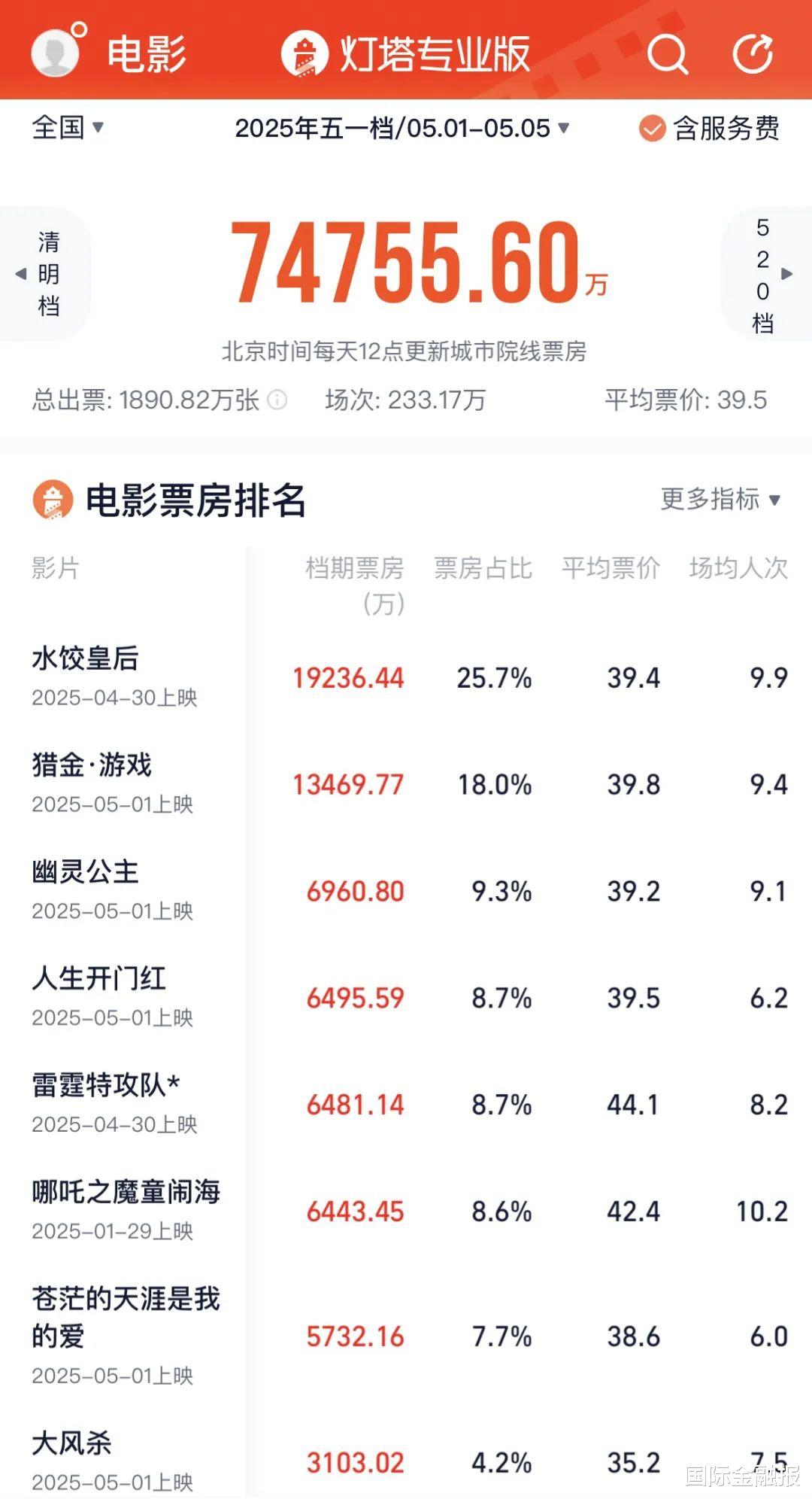 据灯塔专业版数据,2025年五一档(5月1日-5月5日),总票房7.48亿元,观影人次超1890万,总场次233.17万。