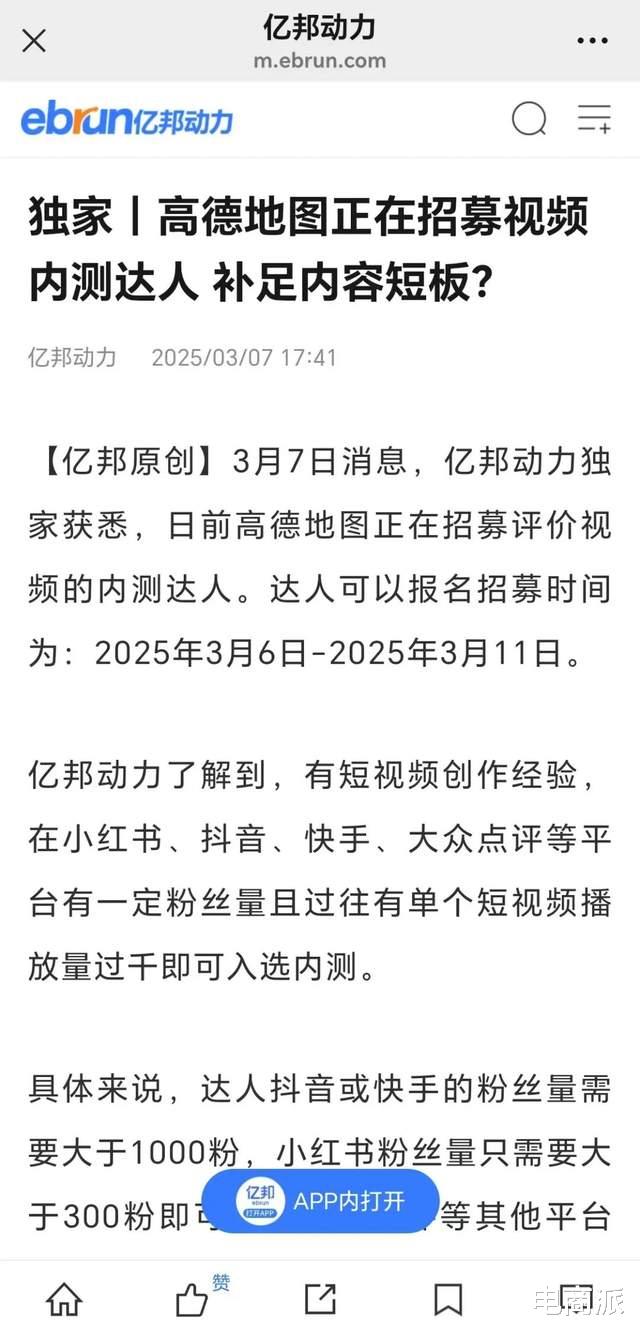 亿邦动力独家透露,日前,高德地图正在招募评价视频的内测达人,报名期限定于2025年3月6日至3月11日。