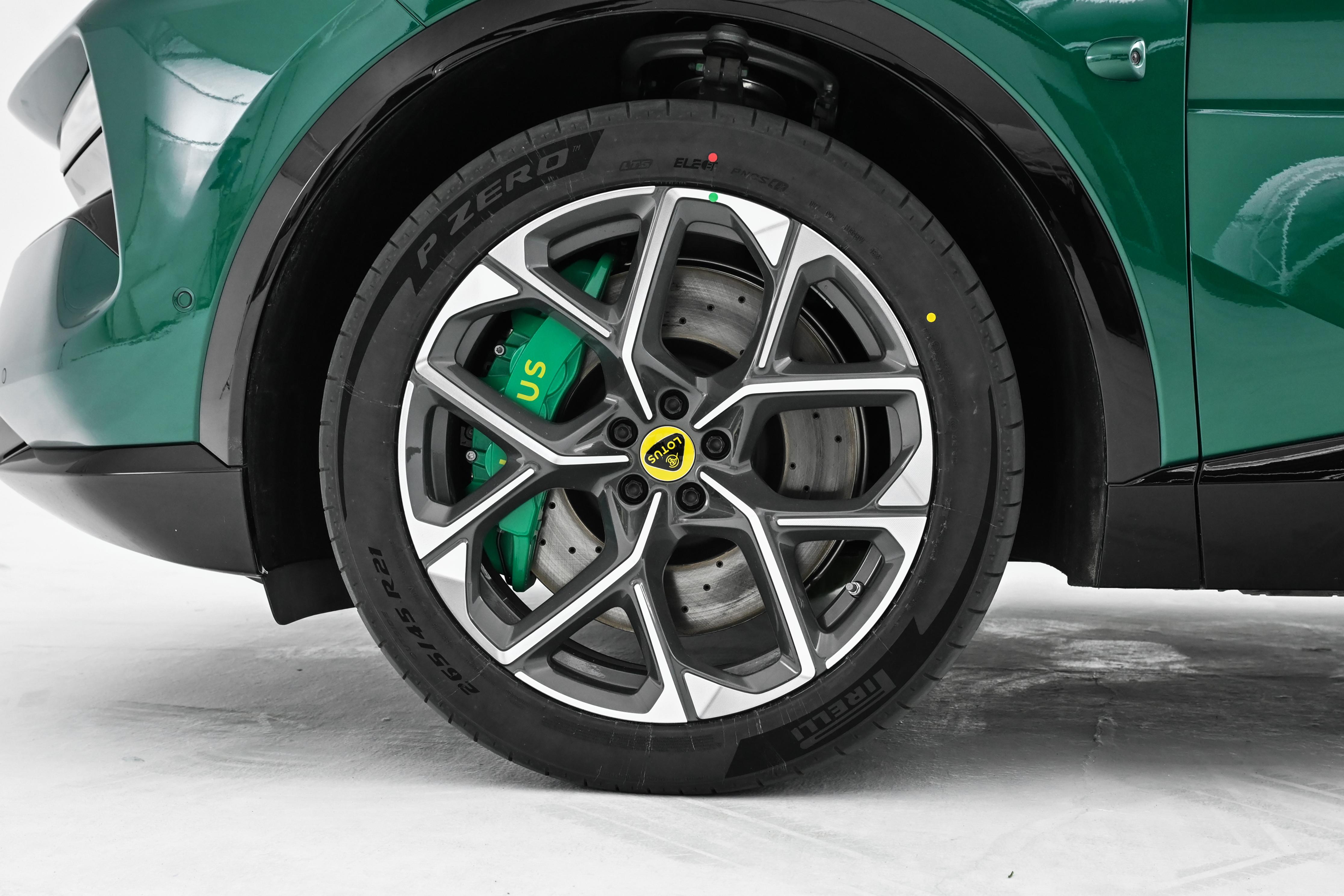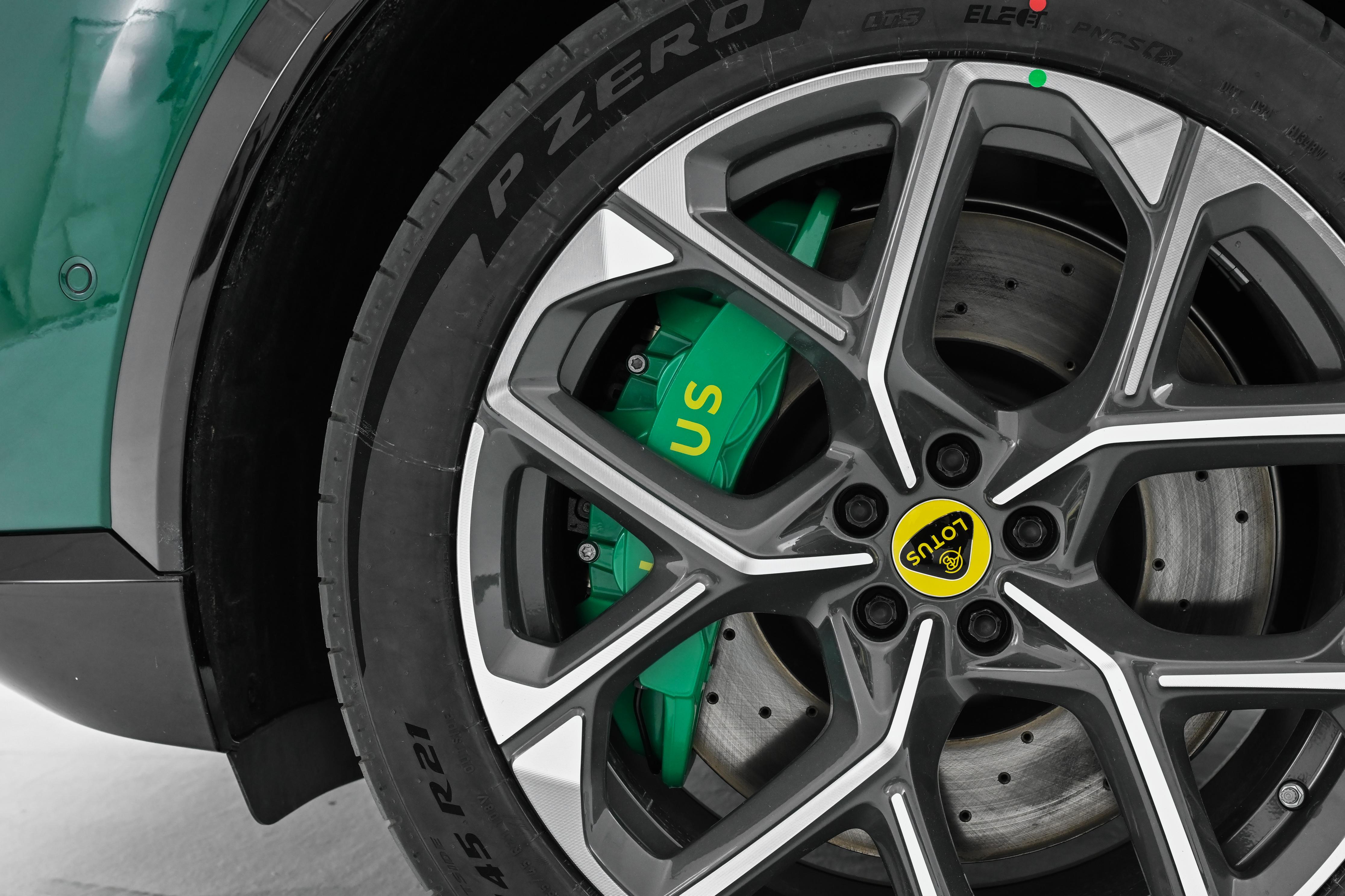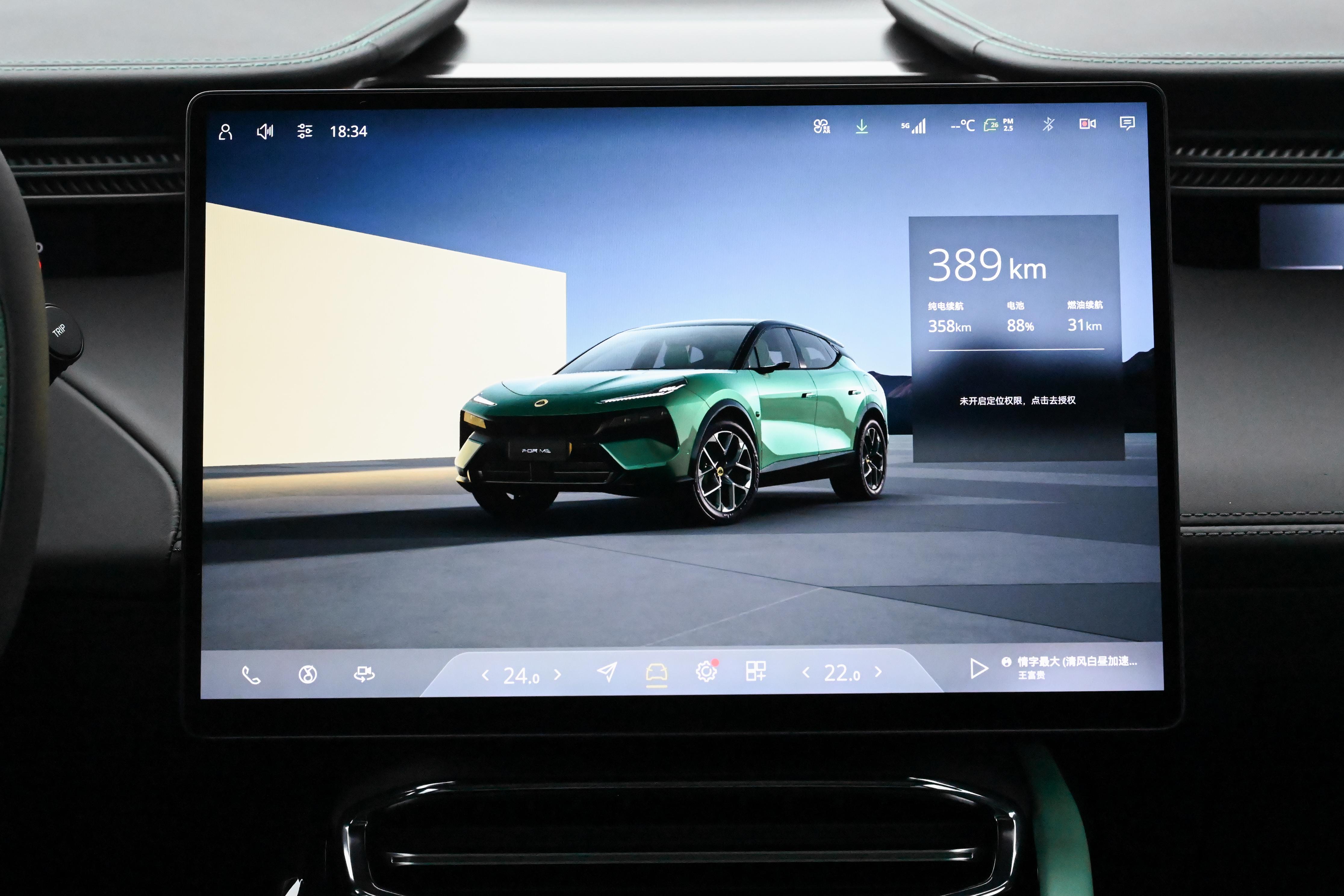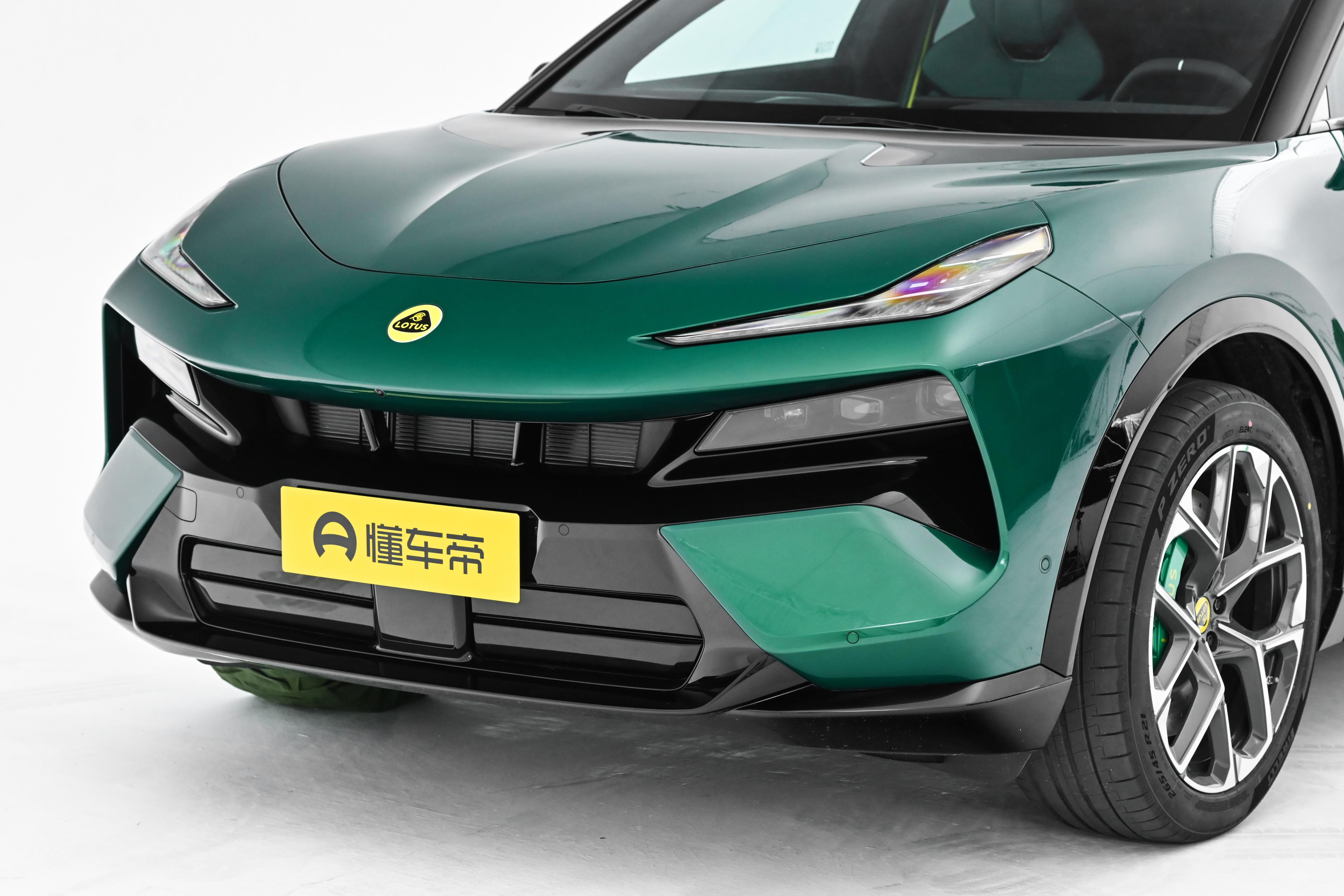 前脸是非常有辨识度的地方。分体式LED矩阵大灯,上面是"回旋镖"日行灯,点亮之后辨识度拉满,晚上开车跟其他车一眼就能区分开。中间是半封闭式菱形格栅,嵌着发光的莲花LOGO,下方是主动进气口,不是纯装饰,跑高速时会自动打开散热,细节挺用心。