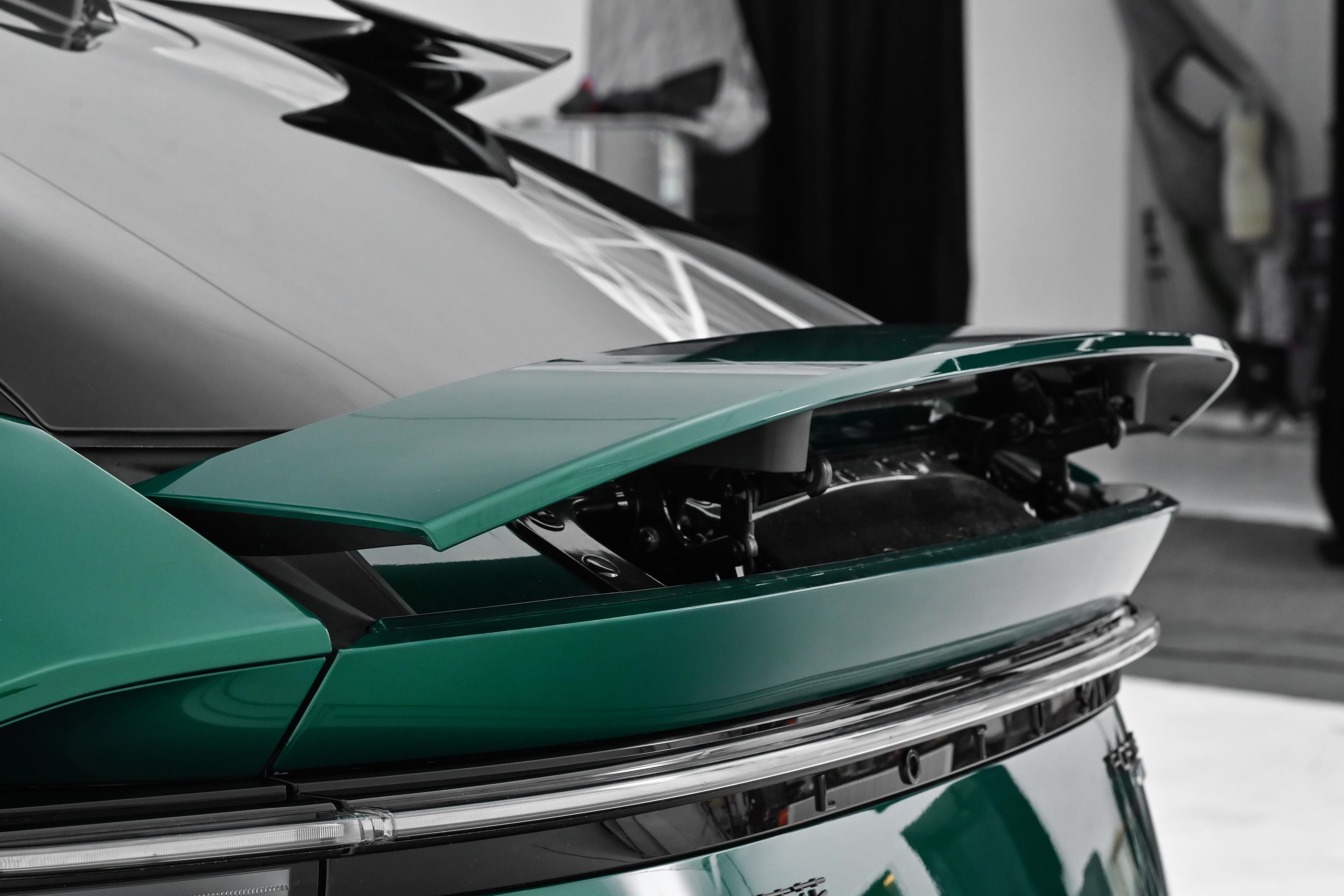 车尾绝对是颜值精髓。贯穿式3D立体尾灯,晚上亮起来特别有质感,还能显示剩余电量,挺贴心。非常帅的是主动式电动尾翼,平时收着很低调,时速超80km/h会自动升到18度,战斗模式下能到32度,能产生112.5kg下压力,高速又稳又帅。后包围是扩散器造型,排气隐藏式设计,整体不张扬但细节全是性能范儿 。