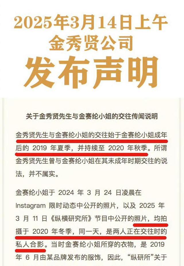 金秀贤方面通过经纪公司发表声明,承认了与金赛纶的恋情,但否认与金赛纶的离世有任何关联。声明中,金秀贤方面对交往时间线进行了说明,强调两人交往期间金赛纶已成年。然而,这一说法与金赛纶生前在社交媒体上的描述存在出入,引发了网友的质疑。同时,关于亲密合影的拍摄时间,双方也存在分歧。金秀贤方面称照片拍摄于两人交往期间,而网友通过服装和配饰等细节推测,照片拍摄时间可能更早。双方各执一词,真相变得更加扑朔迷离。