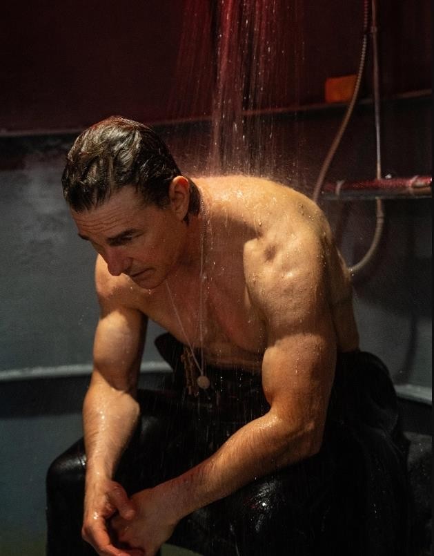 当63岁的阿汤穿着泳裤扎进零度海水,肌肉线条紧致得像四十岁,皮肤却诚实地暴露了一切:脖子上的纹路像刀刻的褶子,脸颊也凹了进去,那些曾在《壮志凌云》里迷倒众生的青春胶原蛋白,早已蒸发在几十年的特技片场里。 镜头偏还特别残忍——冰水刺激下他的肢体反应、扒飞机时被强风拉扯变形的面部肌肉,全给超清特写怼在银幕上。