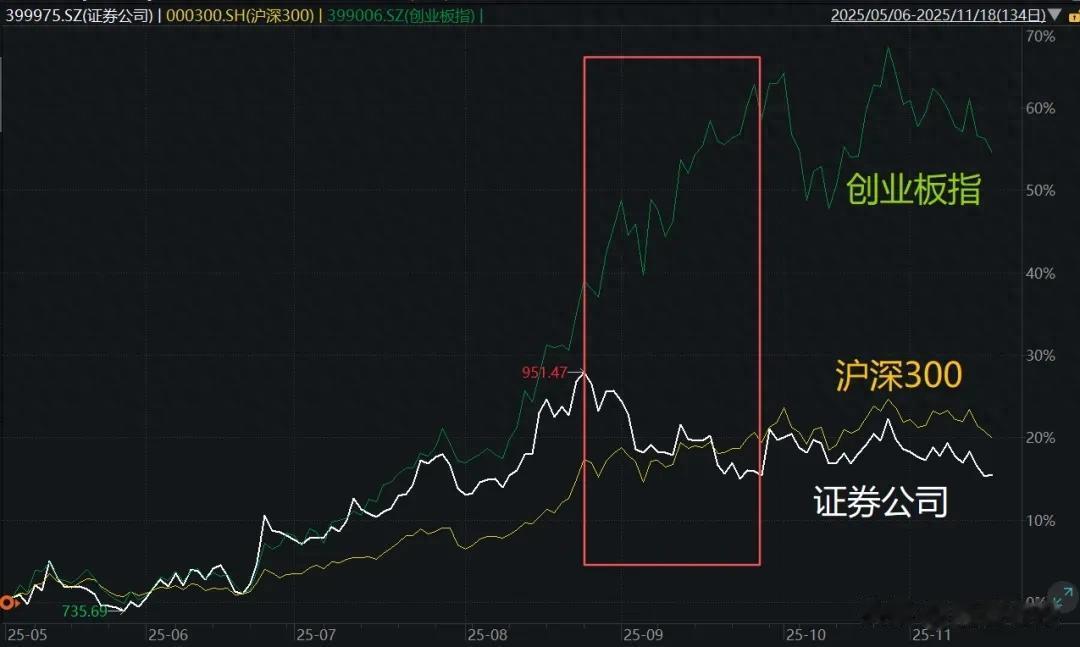 很多人想不明白,8月26日到9月23日这近一个月内,无论是沪深300还是创业板指,都是整体上行的,那段时间A股整体行情很好,大家都在喊着牛市,可为啥作为“牛市旗手”的券商板块反倒萎靡,乃至跟大盘走势显著背离了呢?