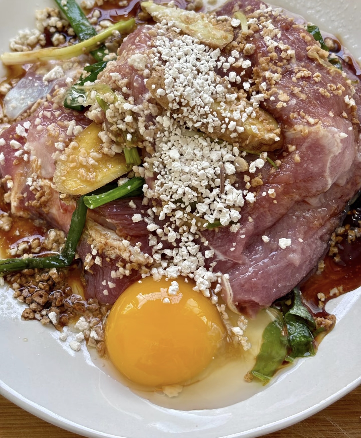 接下来是腌制环节,这是肉嫩爆汁的核心秘诀。往处理好的梅花肉里加入适量盐,用手抓匀,让盐初步渗透;再倒入2勺生抽提鲜,注意不要放太多,避免颜色过深。最关键的一步是加入葱姜水,提前把葱段和姜片放入碗中,用热水冲泡,放凉后用手挤压出汁水,分3次加入梅花肉中,每次加入后都要顺着一个方向用力抓拌,直到肉质完全吸收汁水,变得黏手。然后加入1勺玉米淀粉,淀粉能在肉的表面形成一层保护膜,锁住水分,让口感更滑嫩;最后打一个鸡蛋,继续抓拌均匀,鸡蛋液能让肉质更嫩,还能让后续煎制时更容易挂住酱料。抓拌好的梅花肉要盖上保鲜膜,放在冰箱冷藏腌制30分钟,时间一定要够,让调料和汁水充分融入肉里,这样吃起来才够味。