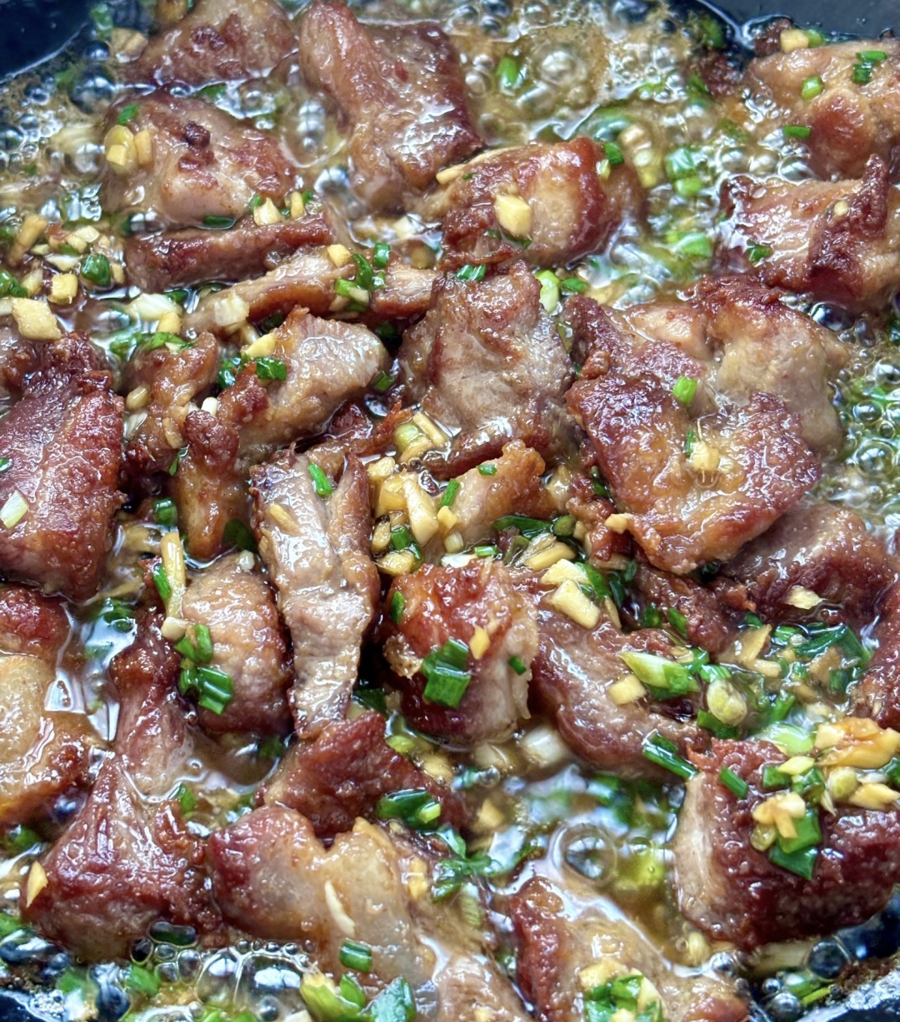 最后一步就是让香味升华,倒入提前做好的盐葱酱,快速翻炒均匀,让每一块肉都裹上酱料,然后盖上锅盖,转小火焖一分钟,让酱料的香味充分渗透到肉里,同时让肉质吸收酱料的鲜味,焖煮的时间不用太长,否则肉质会变老,失去爆汁的口感。一分钟后打开锅盖,香味瞬间扑面而来,撒上一把新鲜的葱花点缀,就可以关火出锅了。