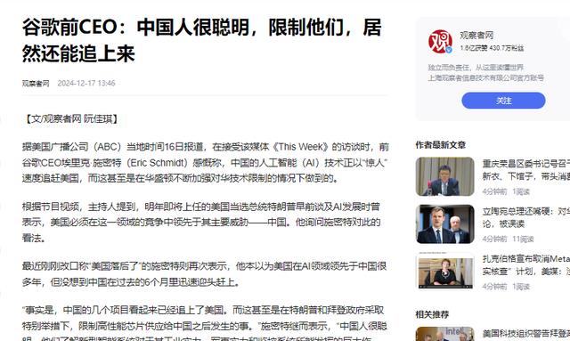 信息来源:观察者网2024-12-17 谷歌前CEO:中国人很聪明,限制他们,居然还能追上来