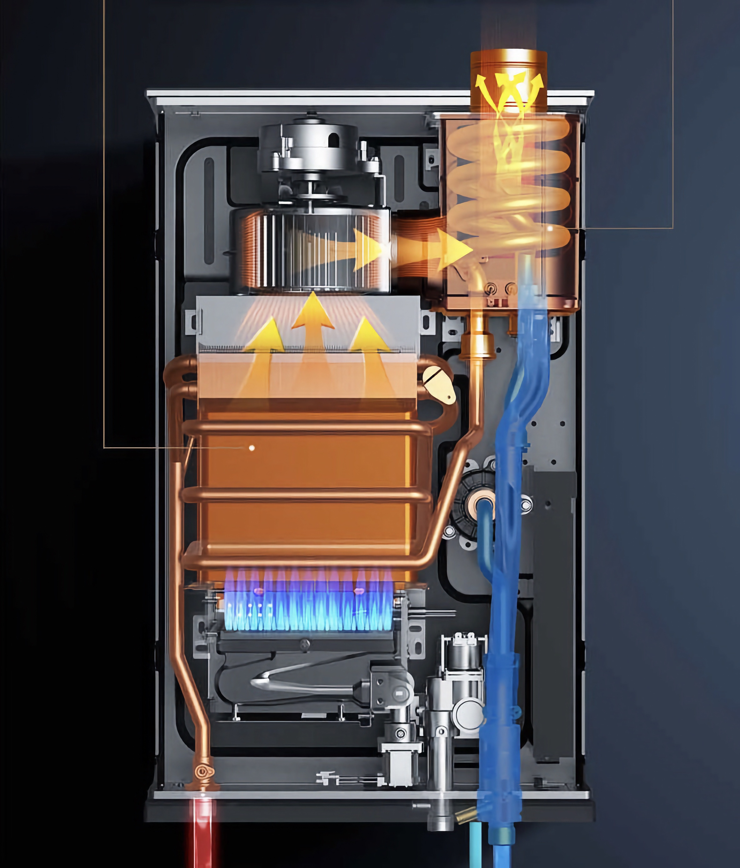所以,现在市面上一级能效的燃气热水器,会将燃烧的高温废气再通过换热器,对进水提前加热,以达到更好的能效利用率。