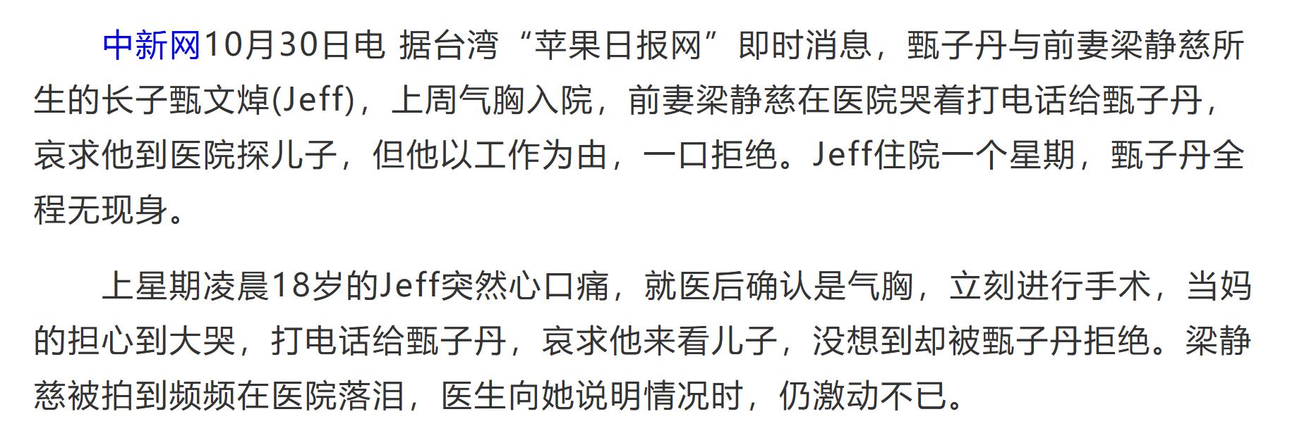 据当时的目击者形容,梁静慈哭着打电话找甄子丹,求他一定要来医院,说儿子情况严重,需要马上动手术,但是甄子丹以工作为由拒绝了。