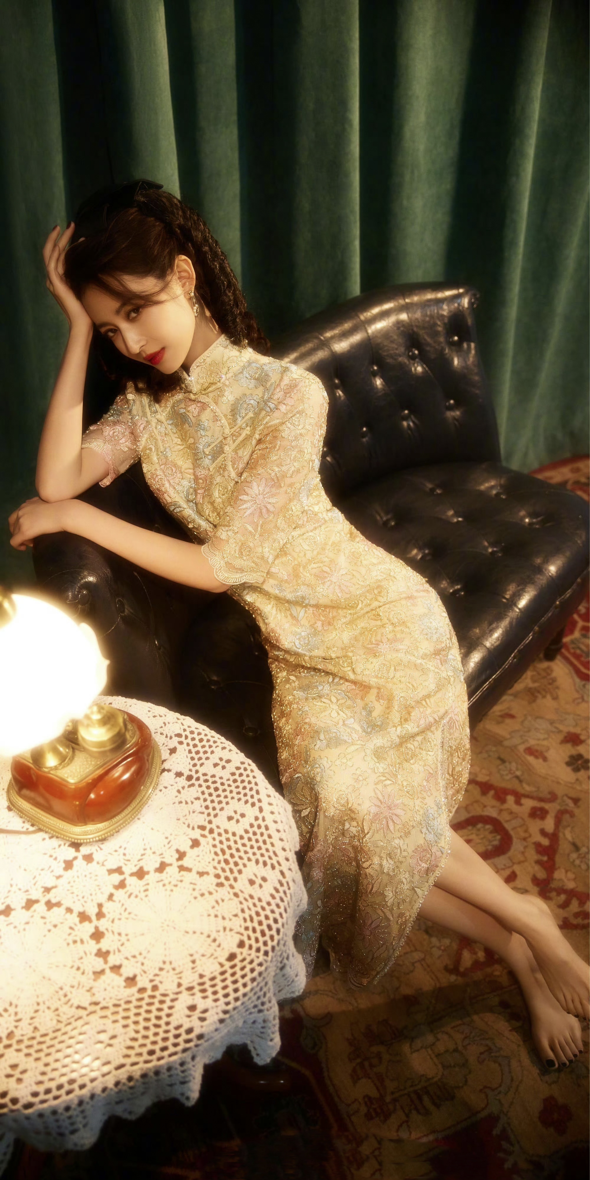 这组写真里的她,是复古光影里长出的仕女图。浅金旗袍覆着薄纱,绣满碎金与淡彩交织的花纹,像把春日的柳烟与秋夜的星光都缝进了衣料里。旗袍的剪裁是最懂她身形的笔:立领收住修长的脖颈,衬得下颌线清浅如远山;腰线微微一收,便勾出不盈一握的纤细,却又在胯间晕开柔和的弧度,没有刻意的骨感,只有舒展的匀称。她赤脚蜷在沙发上,裙摆垂落时露出一截脚踝,像玉簪坠在织金的锦缎上,连随意搭在扶手上的指尖,都泛着瓷白的柔光——这份美从不是锋芒毕露的惊艳,而是像旧书里的书签,温温软软地落进眼里,让人舍不得移开目光。