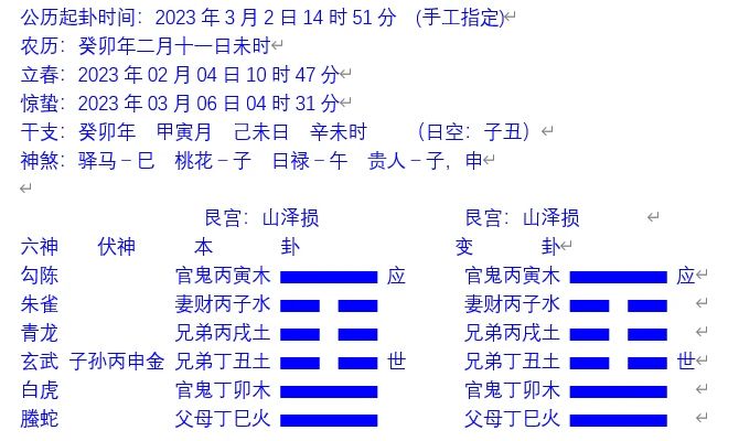 第七卦,于癸卯年甲寅月己未日辛未时问得山泽损静卦。