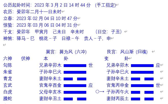 第六卦,于癸卯年甲寅月己未日辛未时问得巽为风之风山渐。