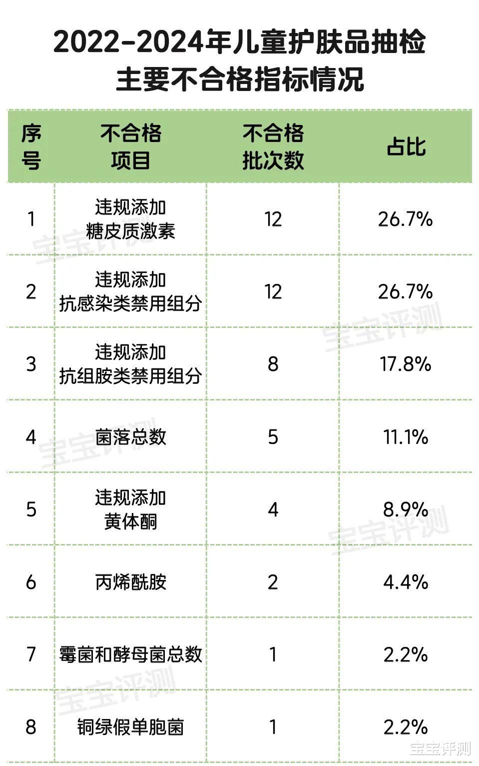 1、违规添加糖皮质激素在近年的婴童护肤品抽检中,不合格情况出现得最多,占比近三成。