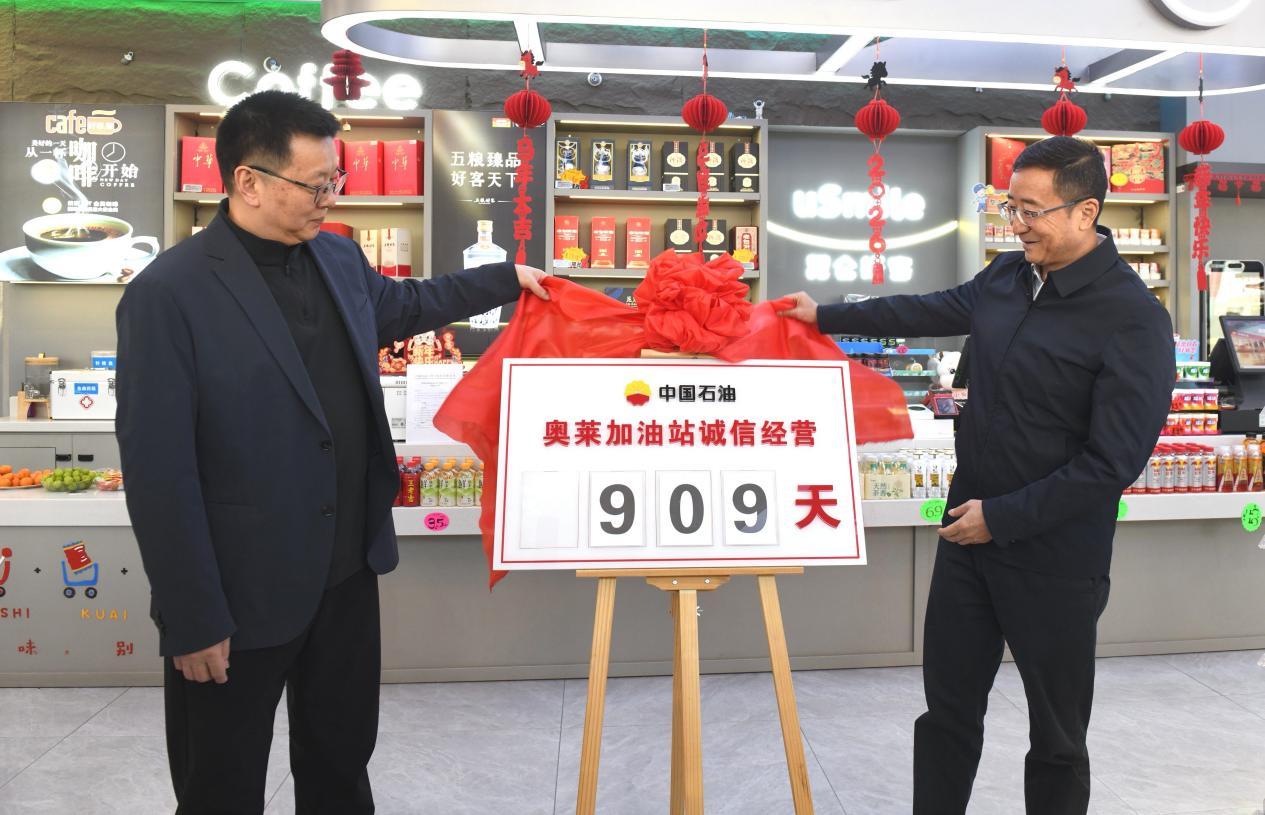 活动现场,在广大媒体朋友的见证下,中国石油山西销售公司副总经理赵向阳与山西晚报社社长李广义共同为奥莱加油站颁授“诚信经营”公示牌,诚邀媒体及广大客户进行监督。公示牌上“诚信经营909天”的字样展现在大家眼前时,现场响起热烈的掌声——这既是奥莱加油站营业909天以来以“数量分毫不差,质量滴滴精纯”的服务赢得广大客户的一致认可,更是山西销售公司重申的庄严承诺,将始终以“诚信”为立身之本,以“服务”为发展之基,坚持从源头把控油非采购、运输、储存、销售等各个环节,确保每一位客户舒心消费、安心消费。