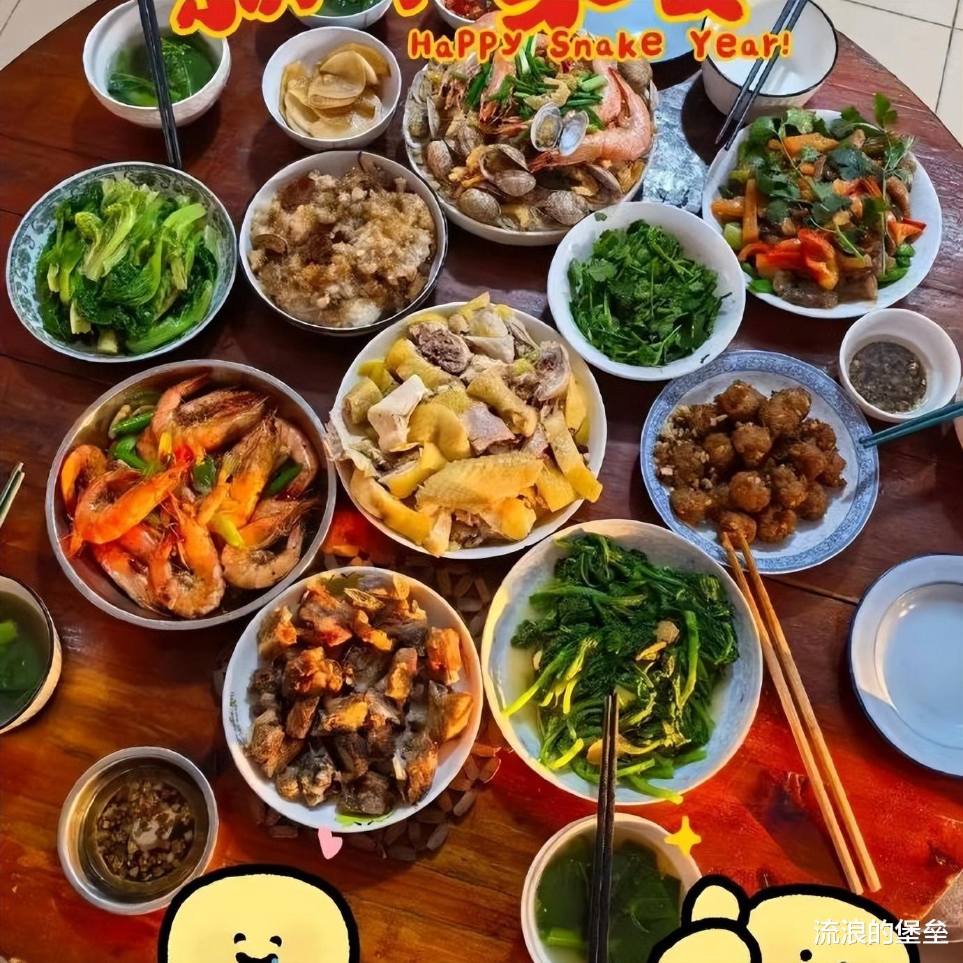 年夜饭也是一目了然,图片放在这里,一眼就能看出是广东人的年夜饭,对于东北人来讲,这一大桌真的没什么食欲,虽然吃肉吃的不多,但是只吃青菜,真的咽不下。而在南方人眼里,东北的年夜饭菜,重油重盐,全都是肉,太过油腻。