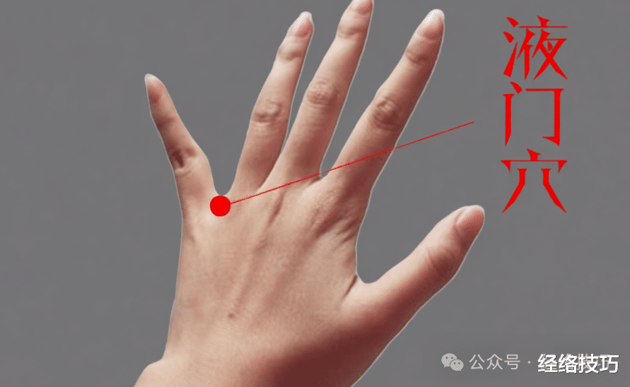 液门穴的位置,在手背上,第四根手指和第五根手指(也就是无名指和小指)的指缝后面,赤白肉际的地方,你握紧拳头,无名指和小指之间的缝隙往后一点,能感觉到有个小凹陷就是。