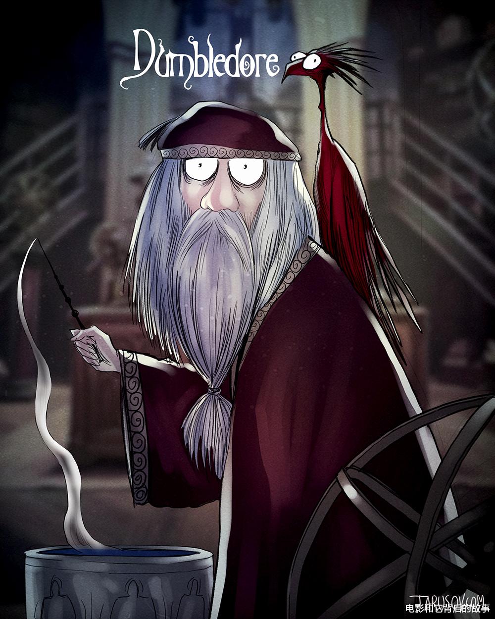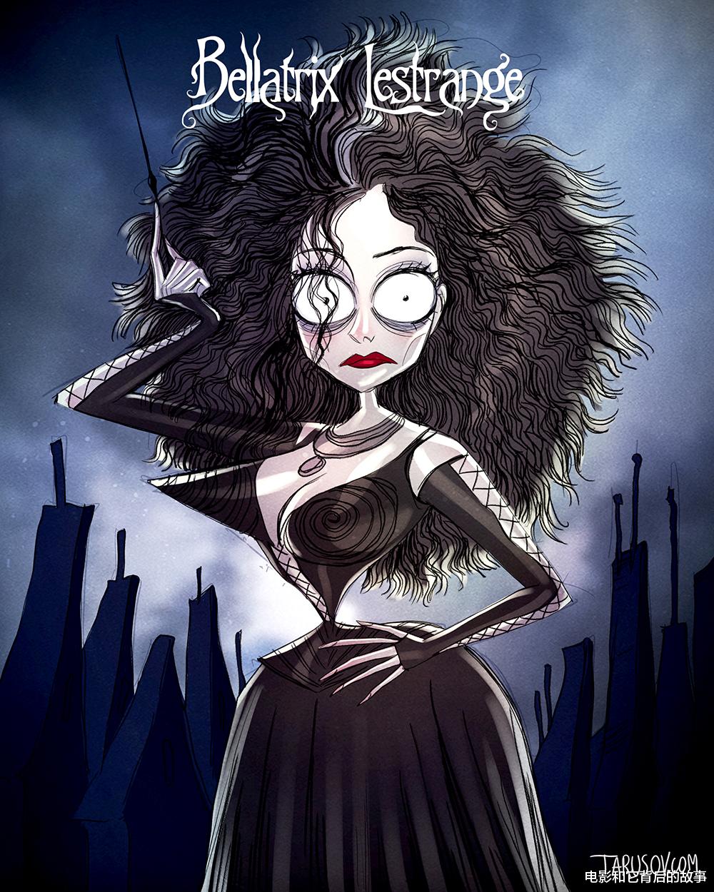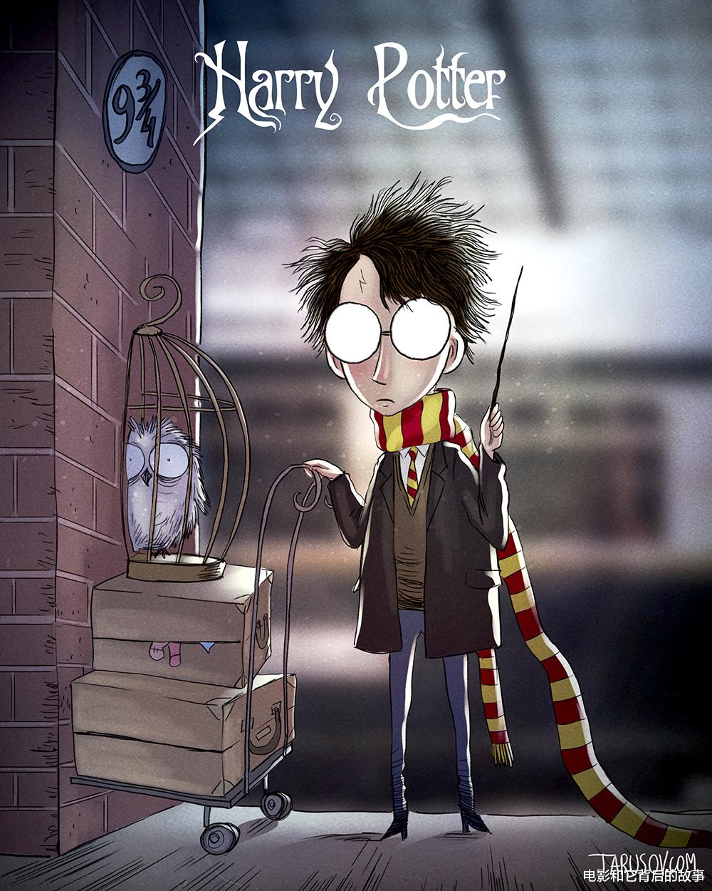 比如插画师Andrey Tarusov就曾经仿照大导演蒂姆·波顿的风格创作了一组《哈利·波特》的角色插画,暗黑又丧丧的哥特风倒真是让人耳目一新。