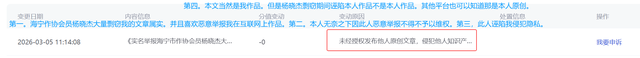 之前剽窃羊白老师作品还不算。我这边发现从2024年9月到2026年2月15日的申明,说明在这段时间内,我在网上看到此人关于发表作品的一些转载或者其他,网站说明等等:没有一个人此人所谓发表是没有剽窃的。