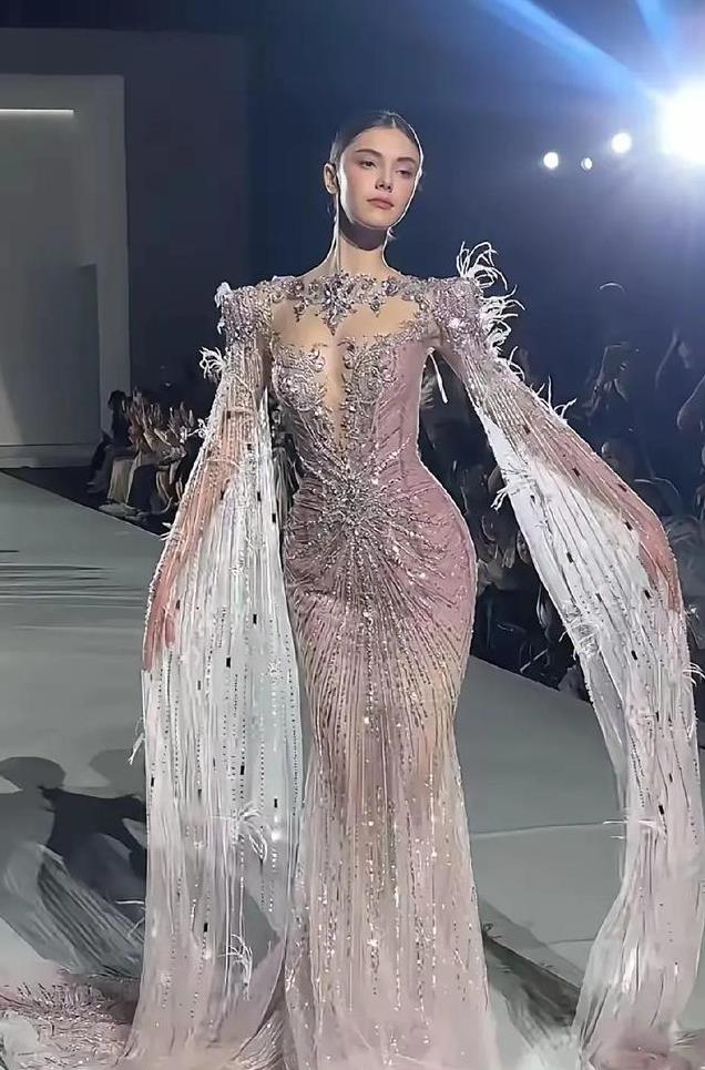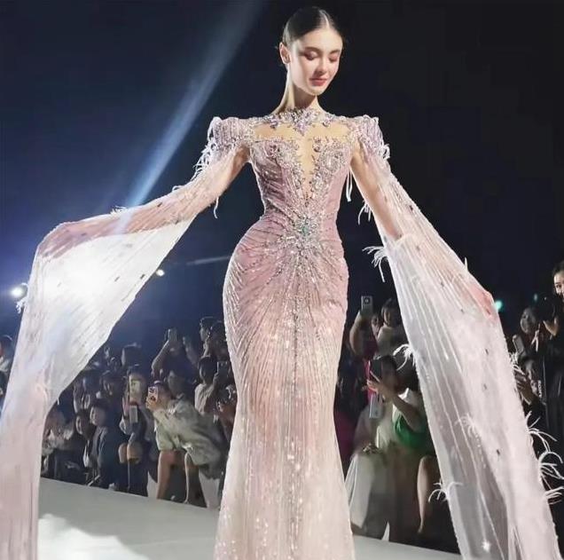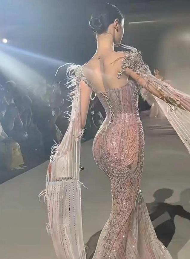 故事的开端,源于三亚婚纱周上Domi的惊艳亮相。她身着一袭粉色鱼尾裙,轻盈地走上T台。