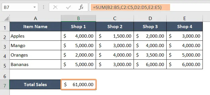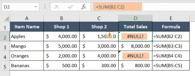 1. 范围内缺少冒号运算符:范围具有开始单元格引用和结束单元格引用。在这两个单元格引用之间,Excel 需要一个冒号运算符。但是,如果某个范围的单元格引用之间缺少颜色运算符,Excel 将返回 #NULL!错误。