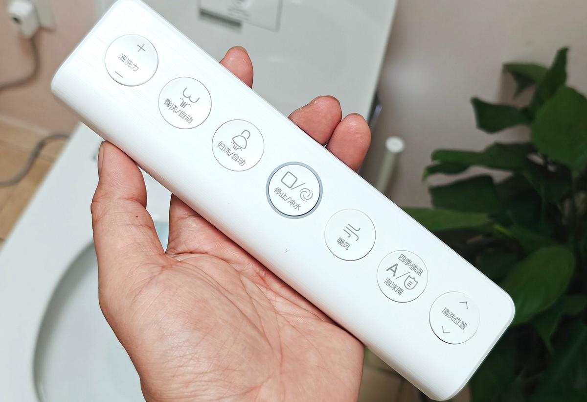 小鲸洗智能马桶 U9还带有一个非常方便的遥控器,各种功能都可以在这里找到,很多功能都可以调节,比如冲水的力度,喷头的位置等等,遥控器的背面居然还有很多控制按键,比如温度控制、灯光控制等等,还能一键切换儿童模式,孩子使用也非常方便。