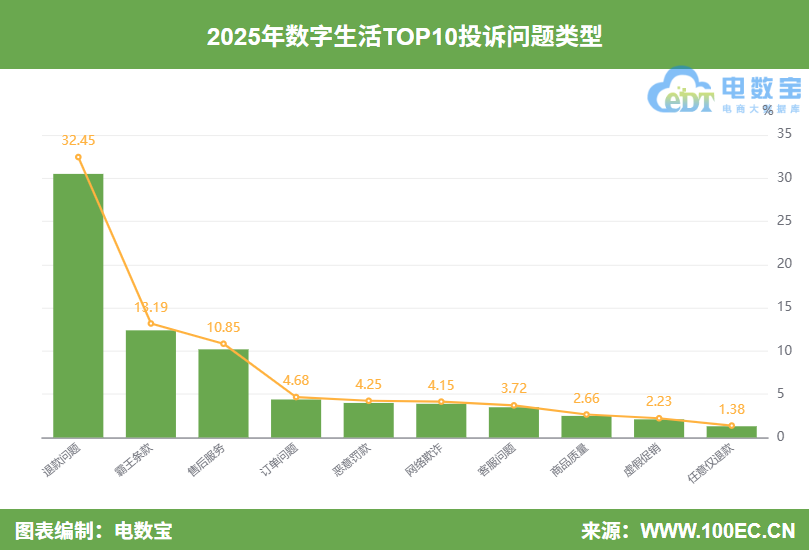 2025年数字生活投诉问题类型排名前十的分别是:退款问题(32.45%)、霸王条款(13.19%)、售后服务(10.85%)、订单问题(4.68%)、恶意罚款(4.25%)、网络欺诈(4.15%)、客服问题(3.72%)、商品质量(2.66%)、虚假促销(2.23%)、任意仅退款(1.38%)。