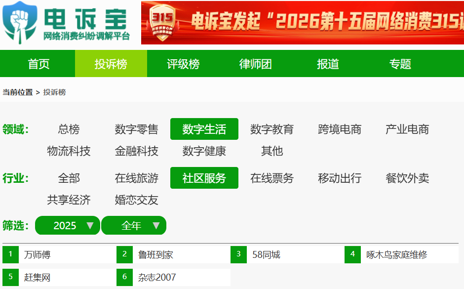 据“电诉宝”2025年受理的中国社区服务领域用户有效投诉显示,入选投诉榜的依次为:万师傅、鲁班到家、58同城、啄木鸟家庭维修、赶集网、杂志2007。