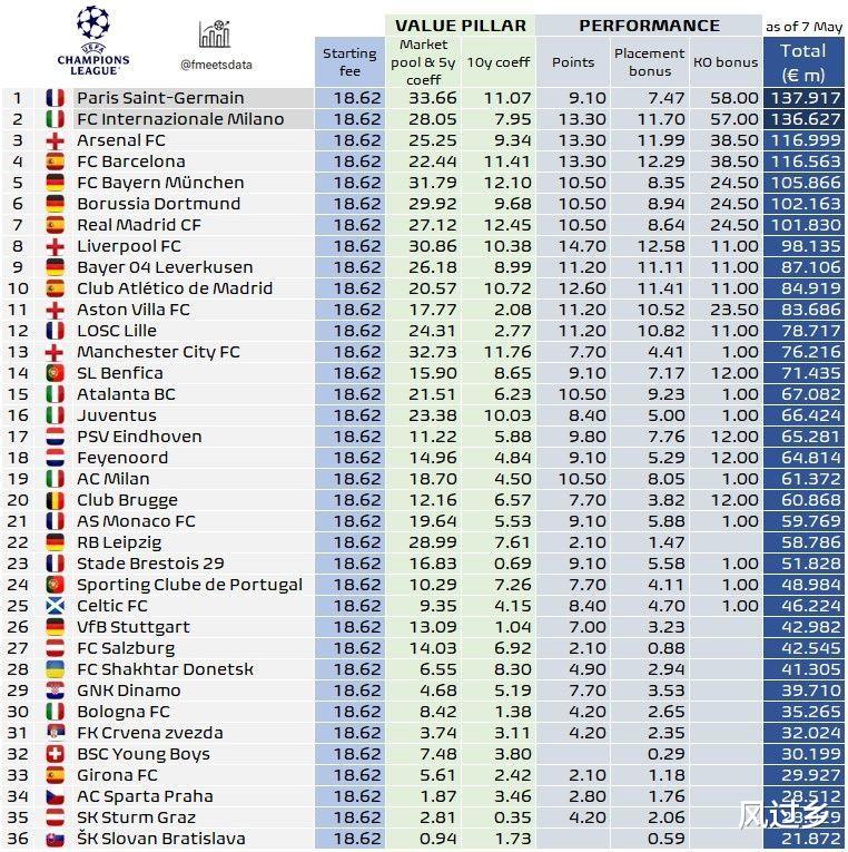 出色的战绩也让巴黎的财政水涨船高。截至目前,巴黎这赛季在欧冠的总奖金高达1.38亿欧,在36支球队中排名首位。6月1日,巴黎若能在决赛中拿下国米,他们的奖金还会继续提升。