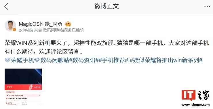 12月11日,闲聊站小号 复读机002 爆料,【荣耀GT2】系列会改名成【荣耀WIN】系列,将在12月发布。