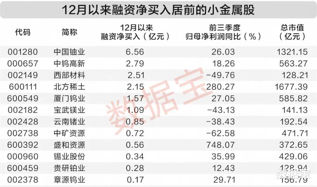截至12月9日,12月以来小金属板块获融资净买入金额达到18.79亿元,其中6股融资净买入金额达到1亿元以上,中国铀业、中钨高新、西部材料净买入金额居前,分别为6.56亿元、2.79亿元和2.51亿元。