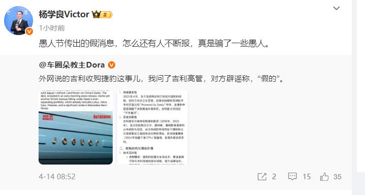近日,有媒体报道称“中国吉利汽车即将收购捷豹汽车”,引发汽车行业广泛关注与热议。针对该传闻,2025年4月17日,吉利汽车高级副总裁杨学良在个人社交媒体上作出明确回应,否认了相关报道,并将此消息斥为“愚人节传出的假消息”,对持续传播此类不实信息的行为表达了强烈不满。