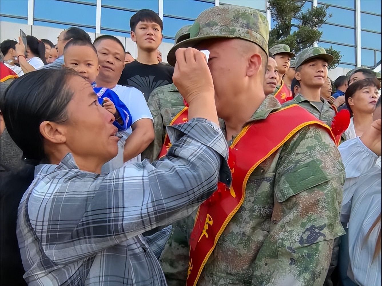 有人整理着孩子的衣领,有人悄悄抹着眼角的泪水,有人拍着小伙的肩膀,每一个动作里,都是藏不住的牵挂与期许。