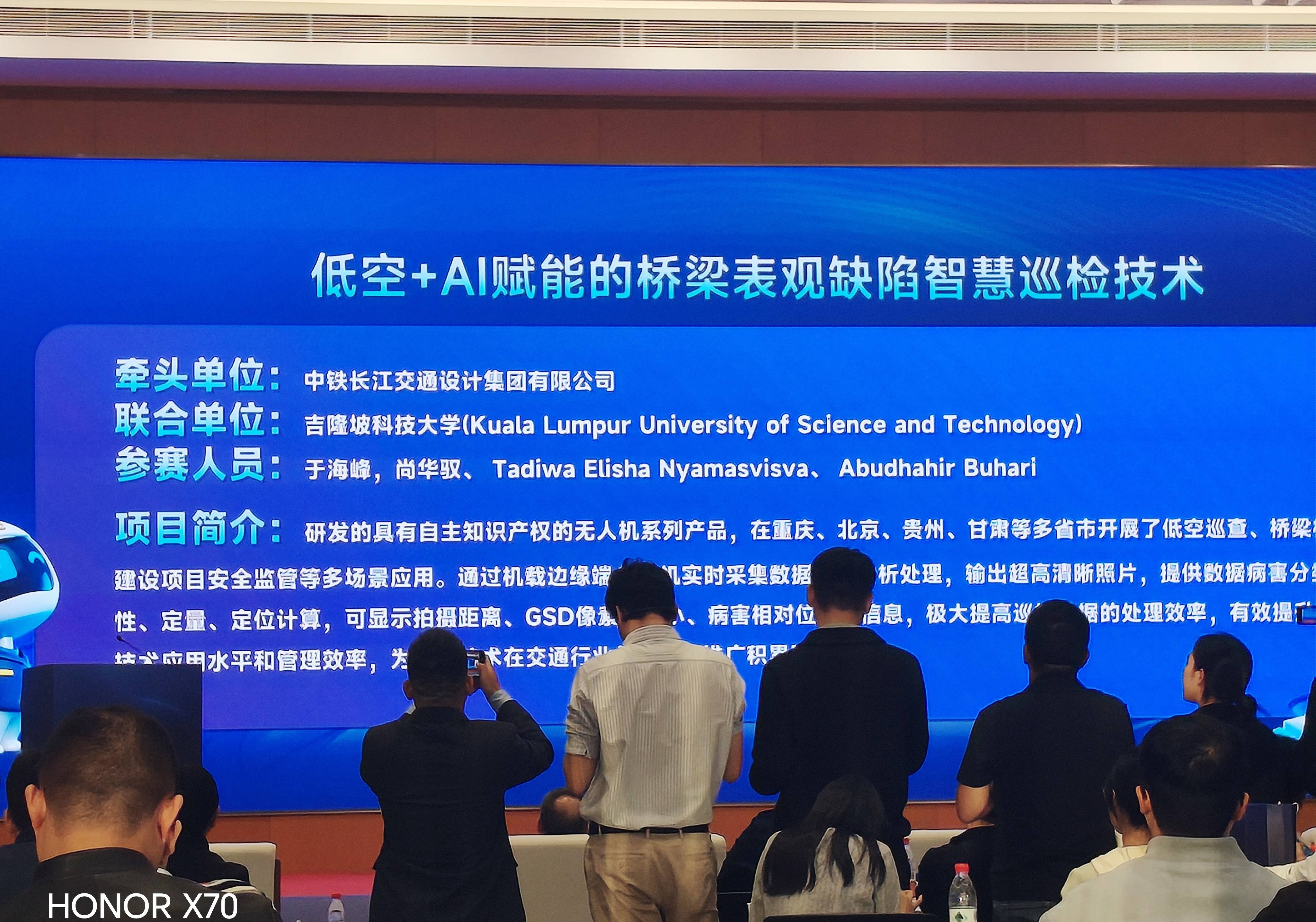 在“AI+低空巡检”赛道中,由吉隆坡科技大学(KLUST)研究生院院长塔底瓦教授等老师和中铁长江交通设计集团有限公司联合组队的参赛项目《低空+AI赋能的桥梁表观缺陷智慧巡检技术》荣获金奖。该项目构建了先进的桥梁无人机智能巡查体系,研发的具有自主知识产权的无人机系列产品,通过机载边缘端AI相机实时采集数据进行分析处理。