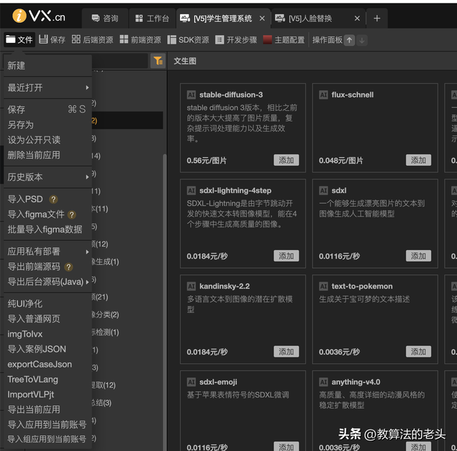 iVX 的 IDE 界面遵循 "所见即所得" 原则,提供画布式开发空间,支持开发者通过拖拽 UI 组件快速搭建界面。例如,构建一个学生信息管理系统时,只需从组件库中拖入表格、表单、查询框等组件,即可完成基础界面布局。更重要的是,其事件流与数据流面板实现了逻辑流程的可视化设计:在事件面板中,通过拖拽条件判断、循环结构、接口调用等逻辑块,可直观定义按钮点击、表单提交等交互行为;数据流面板则以有向无环图(DAG)的形式,展示数据从数据库读取、处理到呈现的完整路径,支持数据过滤、转换、聚合等操作。
