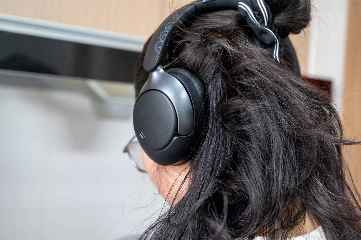 ④ 佩戴舒适贴合:作为长时间佩戴用户,它的舒适度让我很满意。上市前测试过千人份国人耳廓模型,耳机造型能完美贴合国人耳廓,耳罩是蚕丝蛋白软皮材质,亲肤柔软,搭配高弹减压头梁,无论头围大小都能贴合,戴一下午也不会有压耳感、闷热感,久戴无痛。