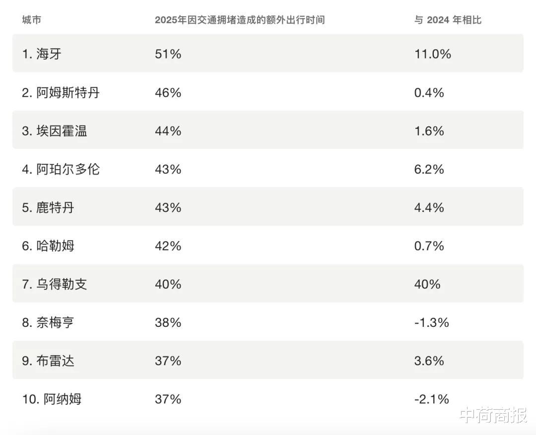在荷兰,没有哪个城市的司机去年比在海牙更常遭遇交通堵塞。一段 10 公里长的车程,平均比正常通行时多花约 8 分钟,相当于 51% 的延误时间,这是导航软件公司 TomTom 的计算结果,他们分析了荷兰 17 个城市的通勤时间。