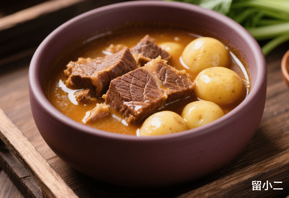 土豆炖牛肉摆盘必呈“山峦叠嶂”状——底层土豆、中层牛肉、顶层浓汁,暗合“天地人”三才。国宴禁用深锅!须用宜兴紫砂浅钵(陶孔呼吸防闷烂),周总理原话:“汤汁要像琥珀裹住山石。”
