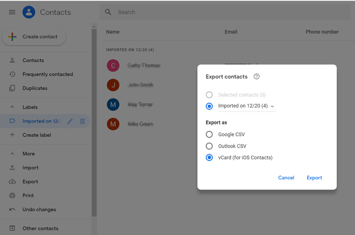 步骤 4. 接下来,再次浏览到左侧,然后单击“导出”按钮,将 Excel CSV 文件导出为 vCard 文件,该文件与您的Android兼容。