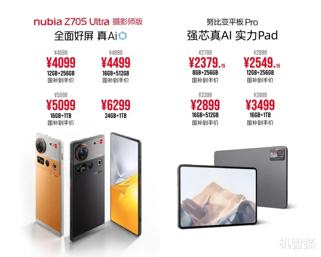价格方面,Z70S Ultra摄影师版起售价4099元,专业摄影套装定价899元;努比亚平板Pro国补后优惠价2379.15元起。全系产品已在中兴商城、京东等平台开启预售,感兴趣可以了解一下。