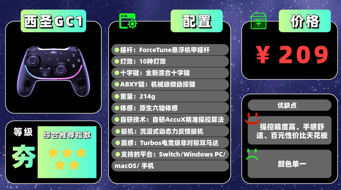 平价游戏手柄比较推荐西圣GC1,这款是目前200价位表现比较优秀的一款。要说当下百元级最能打的游戏手柄品牌,西圣绝对是玩家们最常提起的名字。旗下游戏手柄凭借极高的性价比一举占领同价位市场,在操控精度、按键手感与无线延迟表现上稳稳领先不少竞品,甚至与更高价位的中高端型号正面硬刚也毫不逊色。无论是权威数码媒体的深度测评,还是资深玩家的长期使用体验,都一致将其评价为“2025年度百元游戏手柄的性价比天花板”!