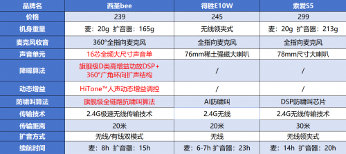 为了让大家更直观对比三款产品的核心差异,精准找到适配需求的款式,我们将西圣Bee、得胜E10W、索爱S5的关键参数进行整理汇总。方便大家快速聚焦关键亮点,避开选择盲区。