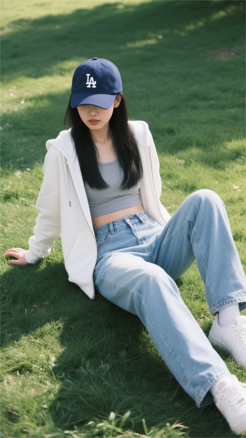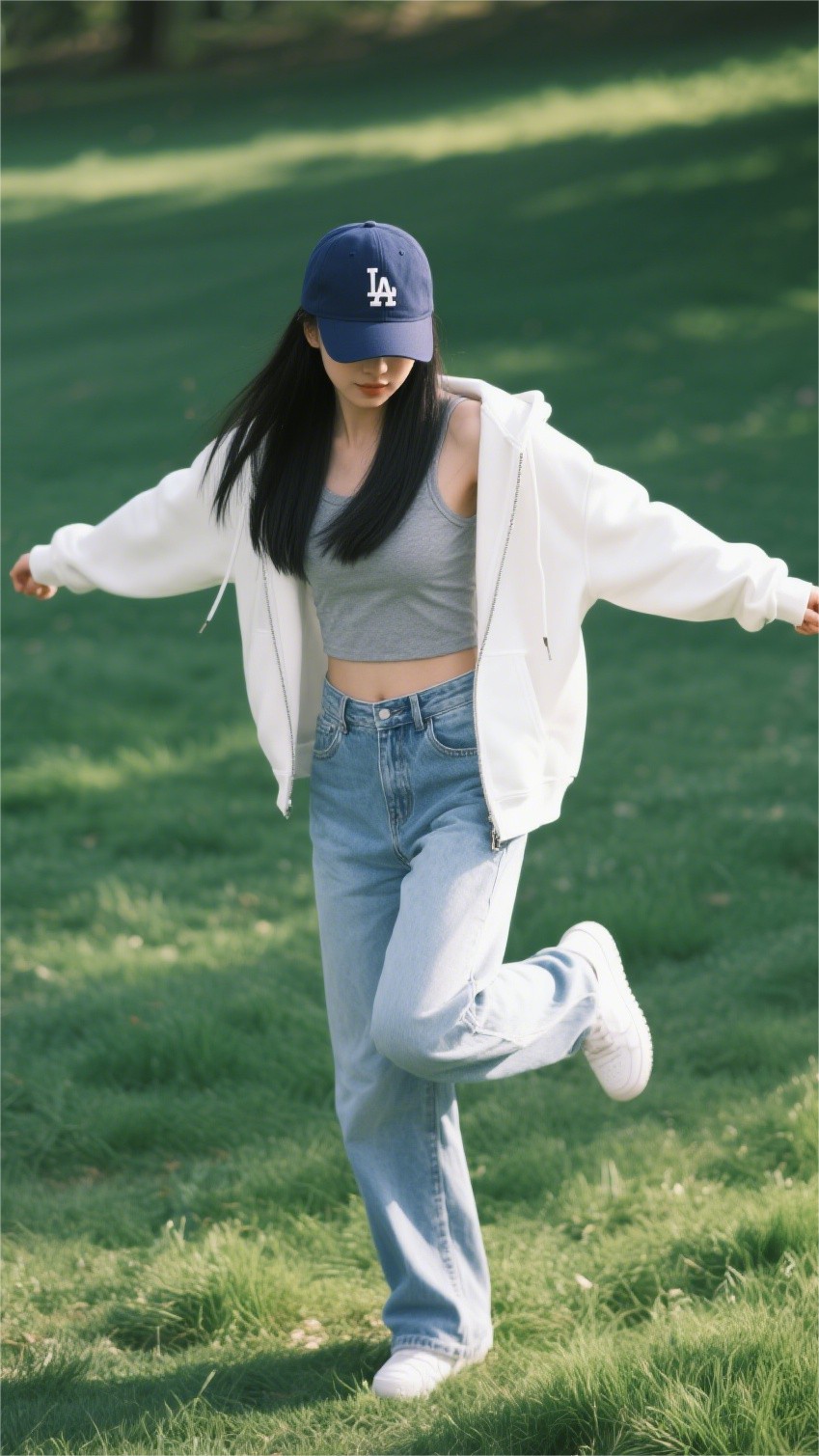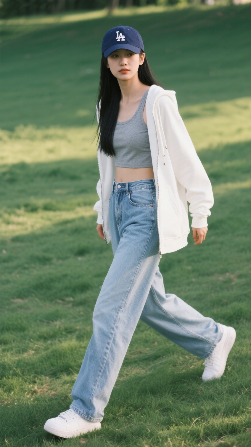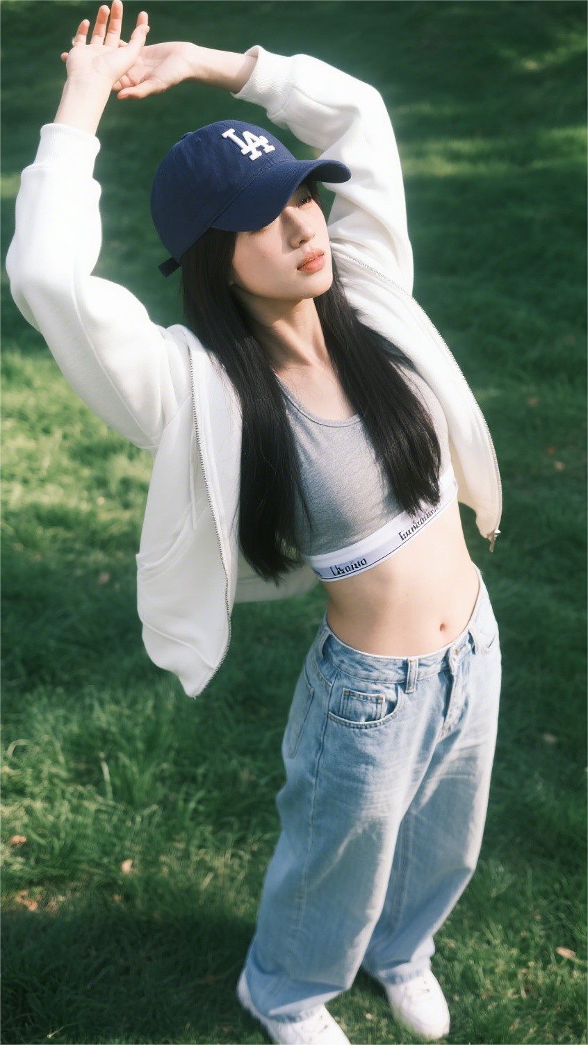 下半身她选择了一条浅蓝高腰直筒牛仔裤,面料挺括、线条简约。裤脚微微堆叠在白色运动鞋上,不仅提升了整体的街头感,也让视觉重心自然落在整体穿搭的“舒适”之上。整套look无明显配饰,唯一的点睛之笔是头顶那顶深蓝色棒球帽——既遮阳,也赋予造型更多“运动场女孩”的气质。