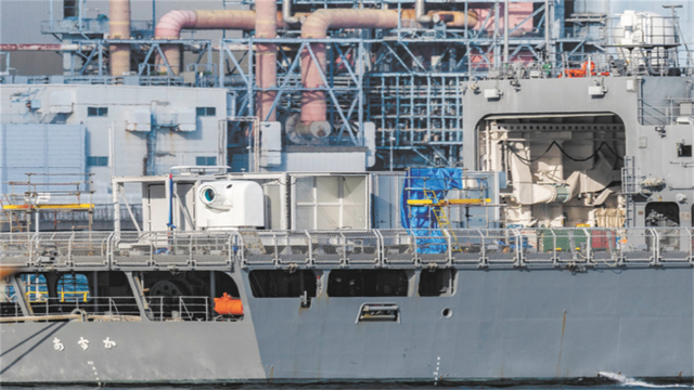 日本防卫装备厅正同步大力推进高能激光武器的研发,将一款新型集装箱式高能激光武器原型机安装在“飞鸟”号专用试验舰甲板上。其由两个标准集装箱组成,主要用于评估对抗导弹的可行性。