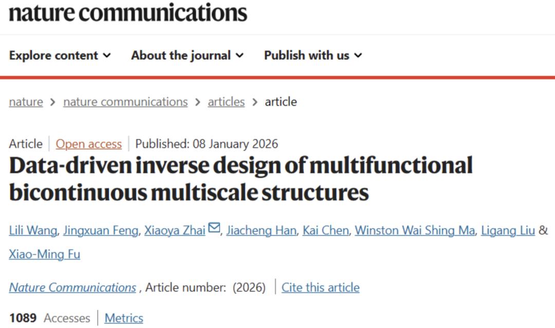 近日,中国科学技术大学(USTC)联合新疆师范大学、中关村人工智能研究院、香港理工大学,在数据驱动的多功能双连通多尺度结构逆向设计领域取得重要突破。相关成果于 2026 年 1 月 8 日以 “Data-driven Inverse Design of Multifunctional Bicontinuous Multiscale Structures” 为题,发表于 Nature 旗下顶级综合期刊 Nature Communications。