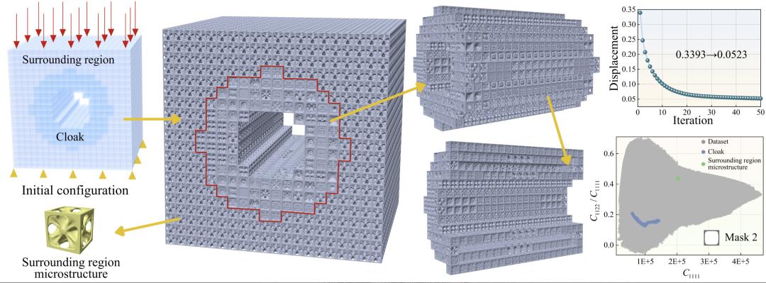 图 4 机械斗篷(20 × 20 × 20 单元)逆向设计结果。右侧展示了优化过程的迭代曲线,以及用于填充隐身体的微结构的性能分布。