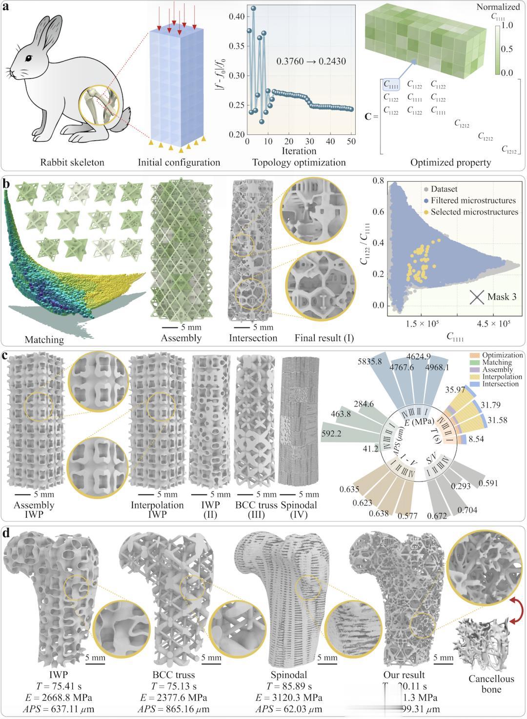 图 3 致密骨与松质骨植入物的多尺度设计。a 初始配置及优化结果;b 多尺度结构的匹配、组装与求交过程;c 本研究结果(I)与三种典型结构:IWP(II)、BCC truss(III)以及旋节线结构(IV)的对比;d 展示了本研究的优化结果与 IWP、BCC truss、旋节线结构在松质骨设计中的计算时间(T/s)、杨氏模量(E/MPa)及平均孔径(APS/μm)的比较。