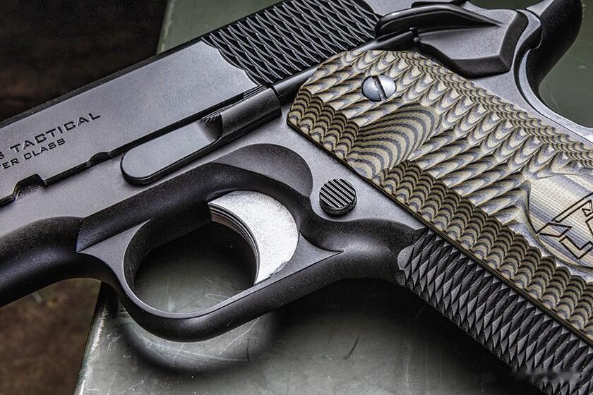 维克斯的经历对手枪“大师班”1911的功能产生了影响。例如,这款手枪上首次采用了编织状防滑纹路。套筒后部是复古风格的战斗击锤、握把保险和拇指保险,均由威尔逊战斗公司用工具钢制造。这些保险装置经过精密加工,完美契合,确保可靠性。