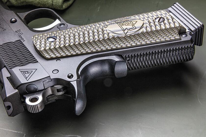 威尔逊战斗公司的海狸尾式握把保险不仅能带来高位握持感,还能防止手部不适和击锤咬伤